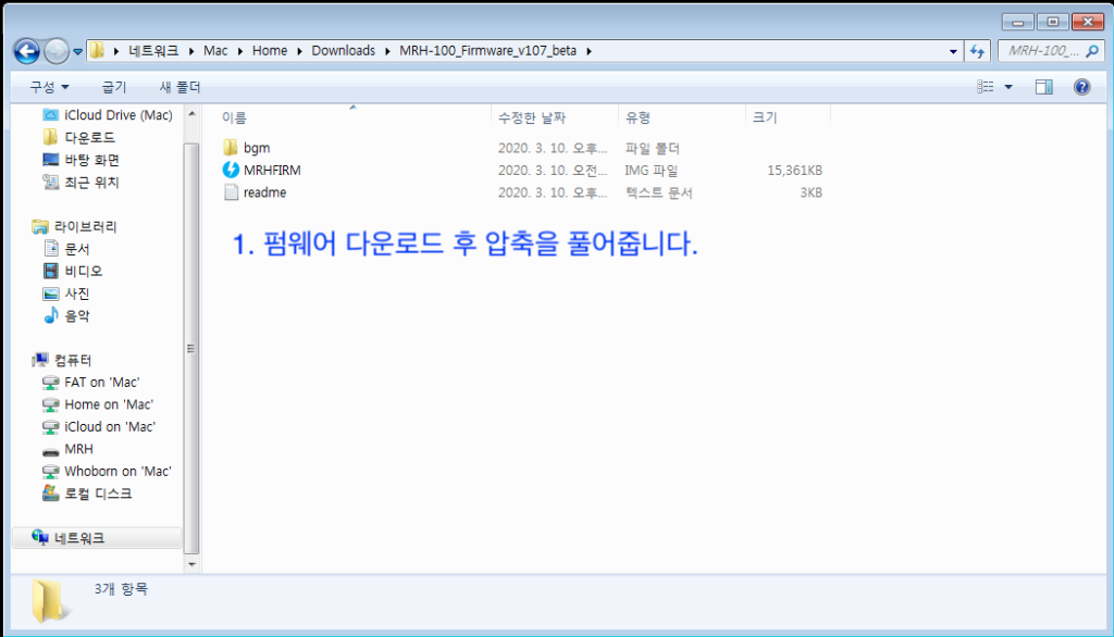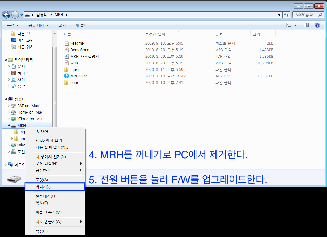 2) MRH를 PC에 연결합니다. 3) 압축을 풀어준 펌웨어 폴더에서 MRHFIRM 파일과 bgm폴더를 MRH에 복사해줍니다.