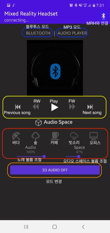 - MRH 기능 설정 (블루투스 모드, 오디오 플레이어 모드, 3D Audio/Walking Mode/Audio Space)