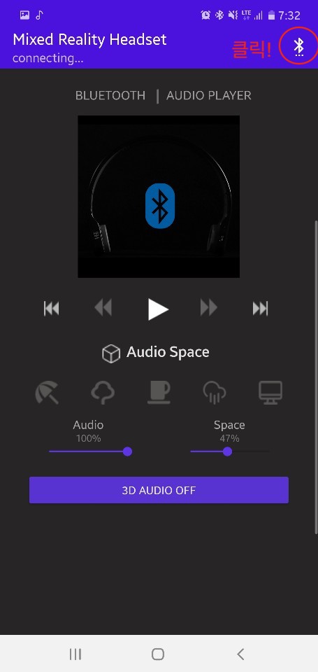 3) 오른쪽 상단의 블루투스 아이콘을 눌러 MRH와 연결해 줍니다.(초기 연결시 필요)